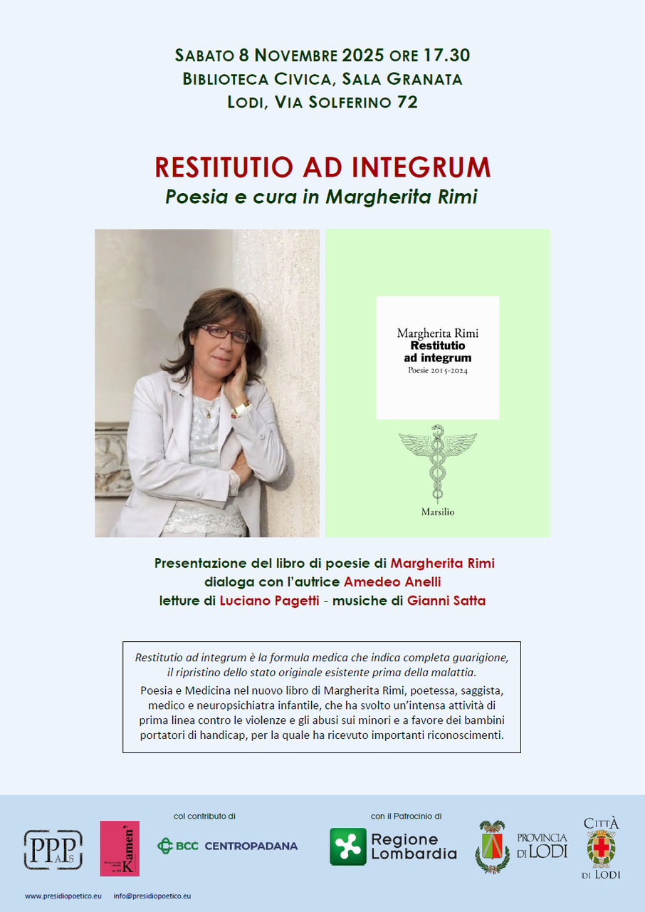 Sabato 8 novembre alle 17.30 nella Sala Granata, presso la Biblioteca Comunale di Lodi in via Solferino 72, verrà presentata la nuova raccolta di poesie di Margherita Rimi Restitutio ad integrum. Poesie 2015-2024, pubblicata nel giugno 2025 dall’editore Marsilio (risvolto di copertina di Gandolfo Cascio).