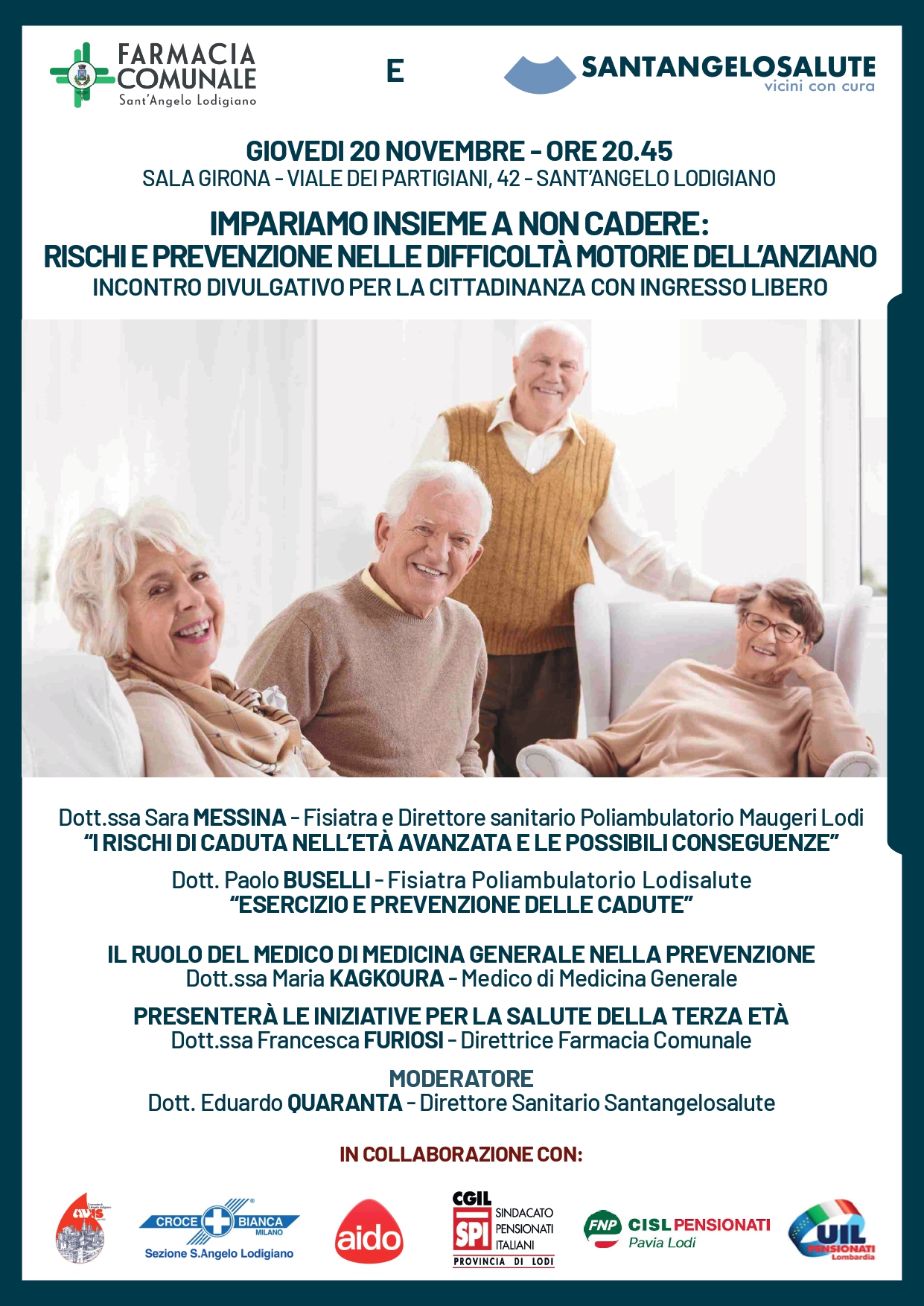 L’appuntamento, dal titolo “Impariamo insieme a non cadere: rischi e prevenzione nelle difficoltà motorie dell’anziano”, è aperto alla cittadinanza e si terrà giovedì 20 novembre 2025 alle ore 20.45 presso la Sala Girona di Sant’Angelo Lodigiano (viale dei Partigiani 42).