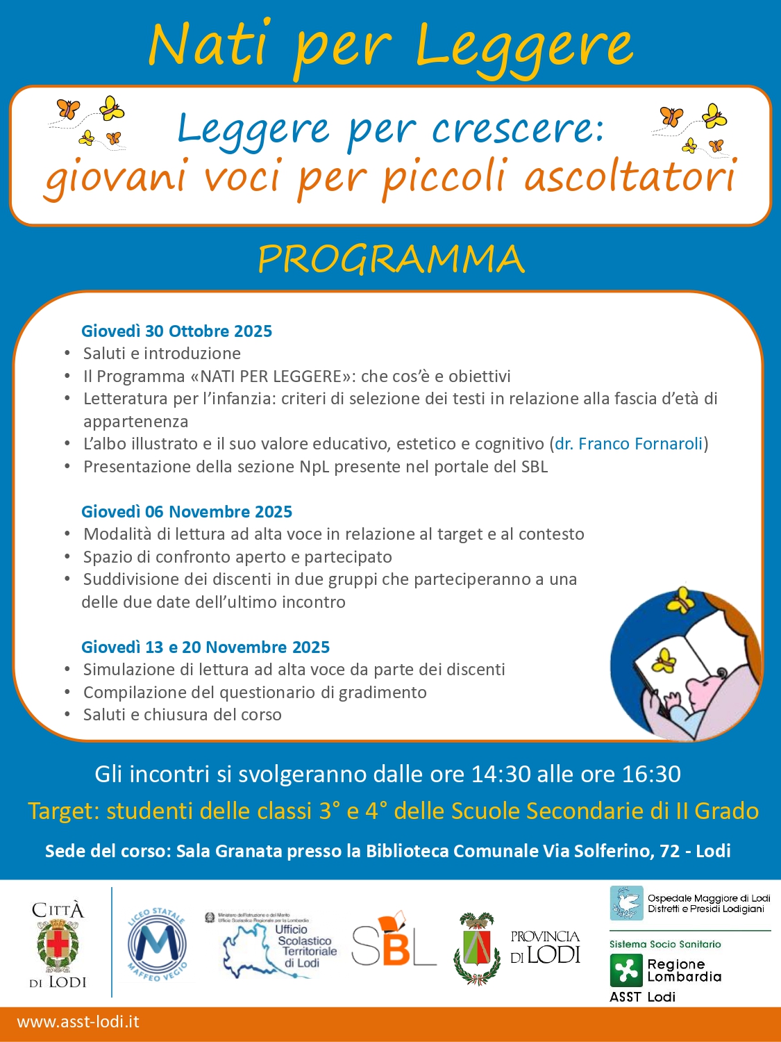 Il Sistema Bibliotecario Lodigiano ha in essere dal 2022 un protocollo d’intesa con ASST (Azienda Socio Sanitaria Territoriale) e Associazione Amici di Serena per la collaborazione ad attività connesse al Programma Nazionale “Nati per Leggere”, che prevede l’ingresso di volontari lettori nei servizi ASST quali la pediatria e le vaccinazioni, per la promozione della lettura sin dalla più tenera età. In questo ambito il Coordinamento Promozione Salute dell’ASST, con il Sistema Bibliotecario Lodigiano e in collaborazione con Ufficio Scolastico Territoriale, Liceo Maffeo Vegio e Comune di Lodi, ha creato il progetto: “Leggere per crescere: giovani voci per piccoli ascoltatori”.