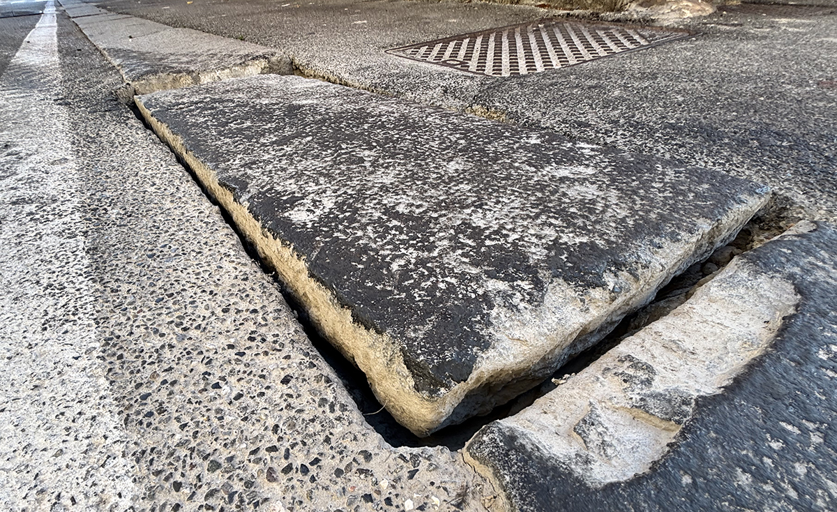 Ma se il lato destro della strada, quello più vicino all’ingresso dell’ospedale, è pieno di trappole per pedoni, l’altro è messo anche peggio: le radici degli alberi hanno sollevato la superficie creando veri e propri ostacoli.